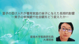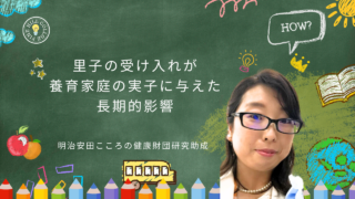 実子に与えた長期的影響の研究 里子の受け入れが養育家庭の実子に与えた長期的影響 本研究は、里子の受け入れが養育家庭の実子に与える長期的影響を、16歳以上の実子を対象とするインタビュー調査によって明らかにすることを目的としています。 2025.08.23 実子に与えた長期的影響の研究